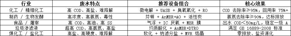 高鹽高 COD:選用耐鹽生化 + DTRO+MVR。